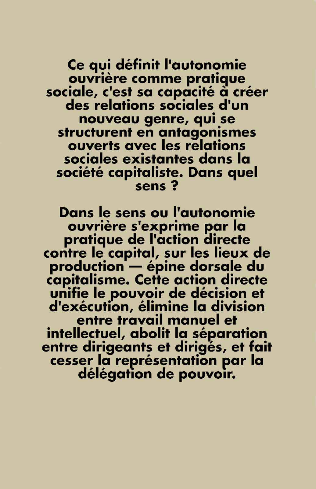Sa seule “cohérence” ne peut-être donnée que dans la lutte frontale contre le capital. Surtout dans la manière que nous avons de nous auto-organiser pour nos propres perspectives. C’est un combat de longue haleine et pas nécessairement linéaire mais il doit être le plus clair possible. C’est peut-être ici que nous manquons de quelque chose ?